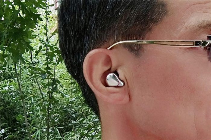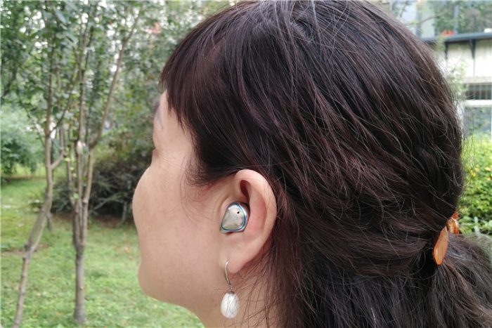 对于娇小的女士来说体积稍显大,耳蜗被塞得满满的,女模特的耳廓前部都被挤变形了,将来应该考虑研发更为娇小的女士专用款。双耳机可配对也可单独使用,比起那种挂在脖子后面的连线形式的耳机好看多了,开机后会自动互联,通过手指点按各按键进行开关机、调节音量、换曲,以及接听、挂断和回拨电话等操作。不过,使用中发现左右耳机按键不是对称布置的,容易混淆,经常按错,统一改为佩戴时前面的为开关键后面的为音量/换曲键,这样比较容易记忆。