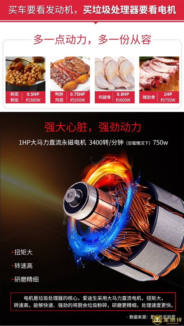 爱迪生18-0厨余垃圾处理器,低价位,高品质,更高性价比。采用0.75HP大马力直流永磁电机,空载情况下转速可达3200转/分钟,能够更加快速将厨余垃圾粉碎,更加节省你的时间。同时它配备三锤两盘的高精研磨系统,可以将厨余垃圾处理的更细、更碎,避免了下水道堵塞的困扰。产品升级,落水口结构为金属结构,相比于塑料材质,金属落水口更加结实耐用不易损坏。