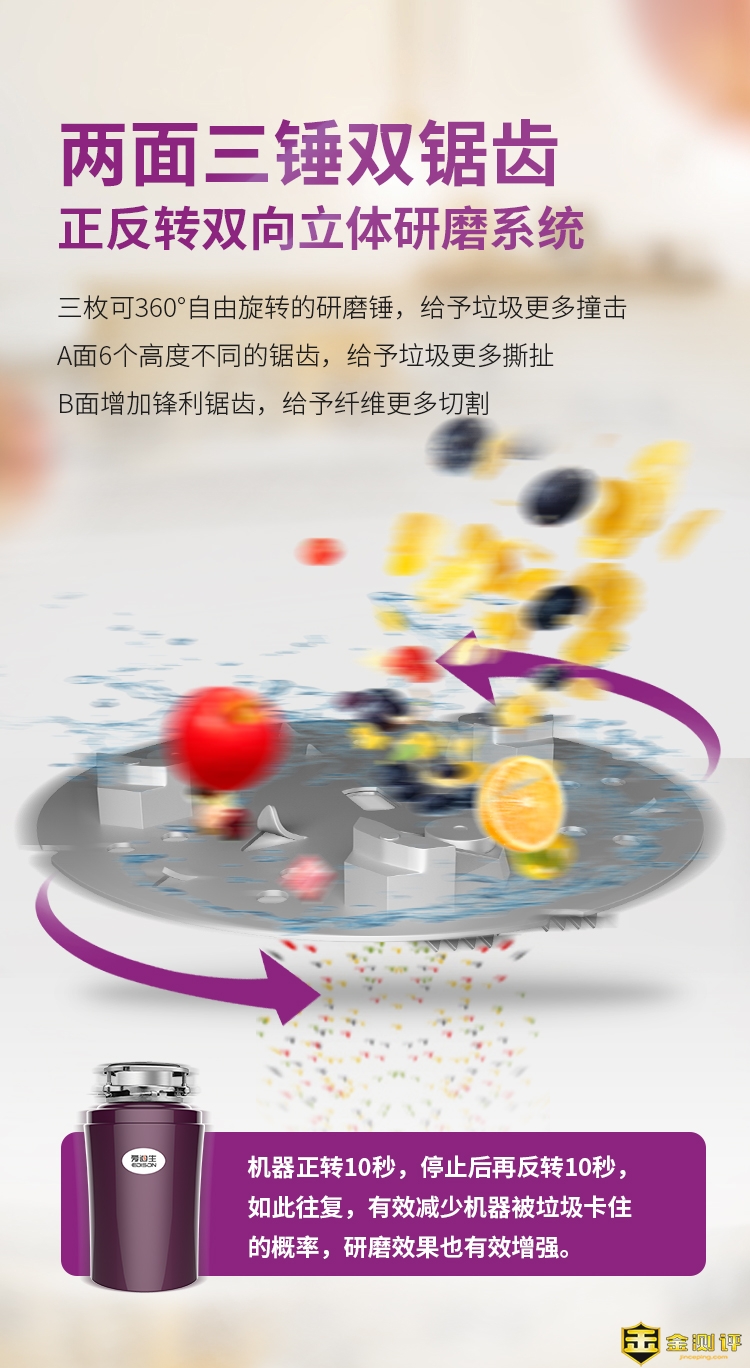 爱迪生X60厨余垃圾处理器,动力十足,搭载0.8HP直流永磁电机,功率600W,机器额定转速高达3250转/分钟。拥有3个可以360°旋转的无刀片合金研磨锤,三级研磨,硬骨头也不在话下,垃圾粉碎地更加彻底,更快速,创新使用正反转双向研磨技术,可以更好的切割纤维,不用担心下水道会产生堵塞问题。并且爱迪生的这款垃圾处理器还配备过载保护、无线开关、静音减震等人性化设计,操作简单,确保安全,有老人和小孩的家庭也可以放心使用。