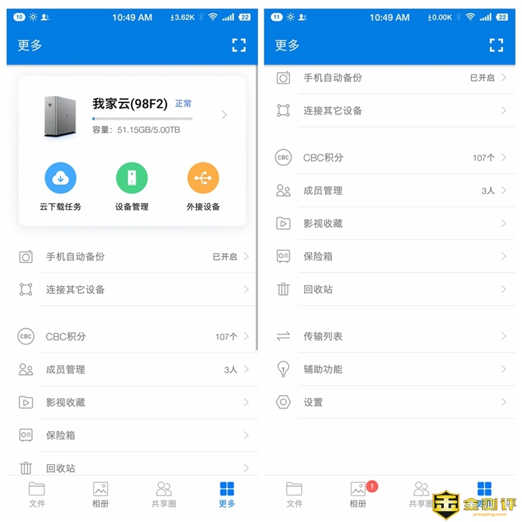 我家云,作为面向普通消费者的产品,则是将主要的用户界面放在智能手机的交互应用上,所以,按照说明书扫码按照APP是必需的了。这里就不繁述安装过程了,无外乎通用的扫码安装APP,手机注册。看下进去之后的管理界面。在页面的下方,可以看出有四个页面,分别是文件、相册、共享圈、更多。那么从这个页面就可以看出,我家云的基本功能方向。
