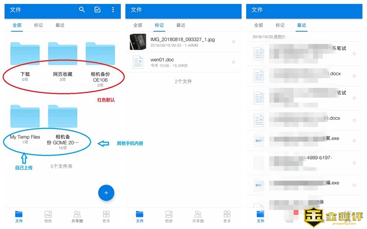 如上图所示,文件页面,分为三个小项目,全部、标记、最近。在全部里面则是所有的文件,其中下载、网页收藏是默认的,相机备份是这个手机的。下方的左侧文件夹 My Temp Files是我自己建立的,右侧是其他手机下的相机备份文件。标记,是类似收藏的意思,可以自己标记些文件,方便快速使用。而最近,则是最近处理过的文件。