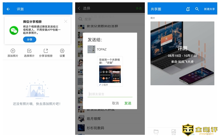如下图展示的,从不同手机看到的画面,这个分享,相当于一个小型的公共布告栏,收到邀请的人,可以共同处理,大家都可以上传图片,可以删除图片,下载图片。
