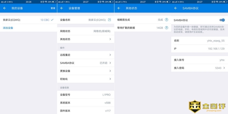 设备管理主要是管理我家云 L1PRO存储器的功能,比如查看网络状态,局域网会有标识,如果远程访问就没有这个标识了。此外这里还可以远程重启我家云,初始化设备,更换不同的我家云等。
