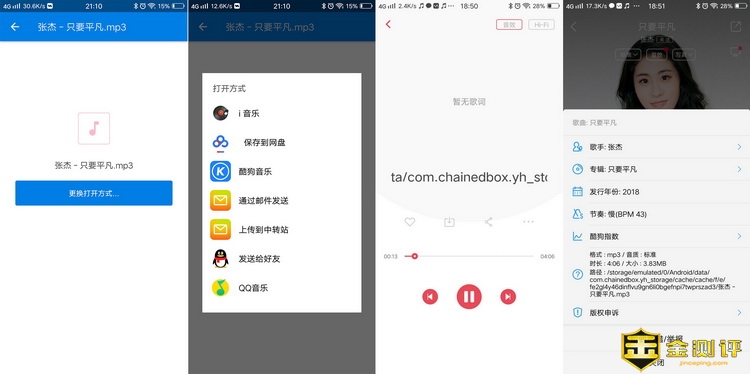 音乐播放可以选择手机的播放器,不过播放前会先下载缓存,在播放器里,笔者查看了文件信息,可以看到是在我家云的缓存文件夹下。