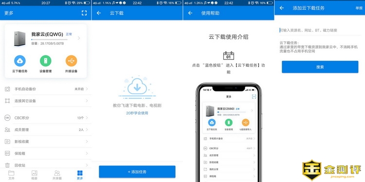 更多里主要是关于我家云 L1PRO存储器的其他功能,这里有一个非常重要的功能,就是云下载任务,云下载任务支持资源名、网址、BT、磁力链接搜索添加任务,这对于下载资源来说非常的方便,有了这个笔者就不用为了BT下载挂机而让台式机一直开着。可以直接放给我家云 L1PRO存储器来完成。通过资源名搜索,然后找到下载链接(电影天堂里的下载成功率会更高),或者通过HTTP网址和磁力链接来下载,都是可以的。这个功能非常好用,但是笔者感觉功能还有很大的开发空间,首先可以将资源名的搜索方式独立出来,弄一个或多个固定的合作下载站点,因为搜索用的是百度,如果站点找不好,就算有BT种子也没用。而BT种子无法使用是笔者觉得很遗憾的一点,希望能增加。还有就是增加多任务链接批量下载或者导入任务列表批量下载,一个一个来挺麻烦的。现在云盘种类不多的,但是资源非常丰富,而且稳定性和速度也不错,所以是很多用户的首选,笔者下载软件和游戏的地方很多都是直接提供百度盘的链接的,所以希望我家云可以针对各种主流云盘提供对应的数据迁移功能,实现把云盘搬回家。