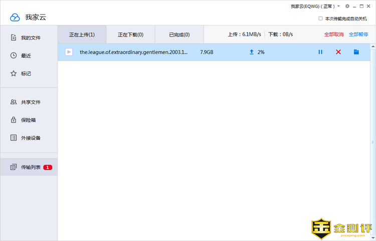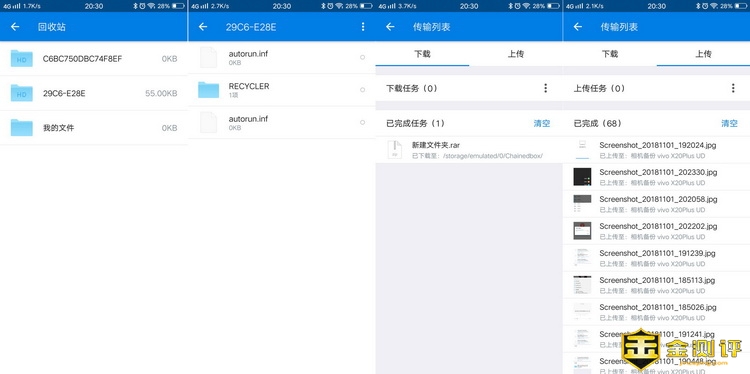 回收站堪称后悔药,在APP里操作的删除都会到回收站里来,如果后悔了就可以恢复,确定要干掉就可以清空。传输列表主要是平时上传下载任务的列表,这里可以显示下载速率和进度,但不是实时更新。