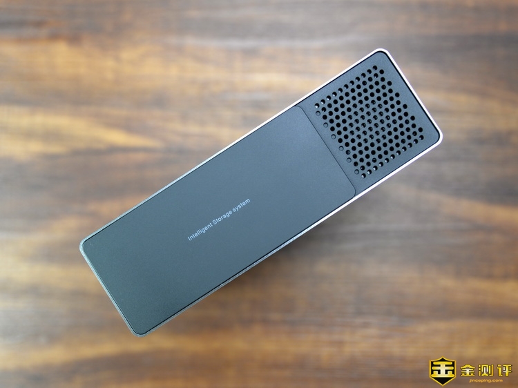机身的顶部印有“Intelligent Storage System”表示,并且在右侧还设计有散热孔,虽然机身采用一体成型的铝合金材质本身就具有良好的散热性能,但是我家云 L1PRO存储器还是很认真的设计了铝制散热片外加风扇来主动散热,这些散热孔就是这个作用的。