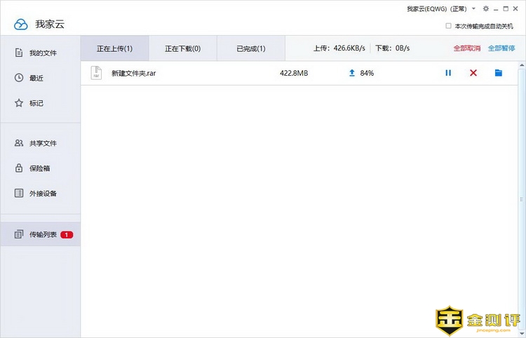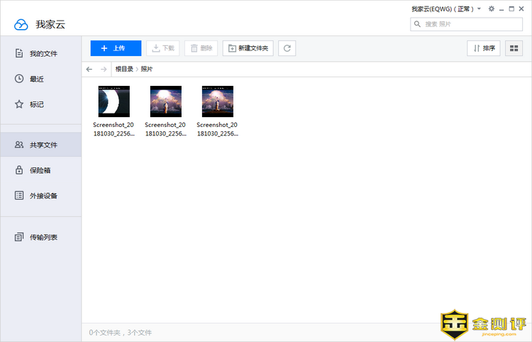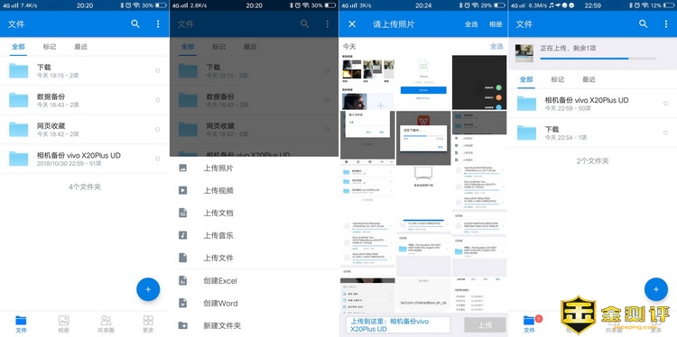 我家云 L1PRO存储器需要先下载APP,然后通过包装盒或者机身侧面的Key来激活,激活后我家云会检测系统版本,如有新版本就会自动升级。等升级完毕后,就可以开始使用了。我家云 L1PRO存储器的APP分为四大块,文件、相册、共享圈、更多。文件指的是当前用户在我家云 L1PRO存储器存放的所有非共享圈的文件,这些文件只能由当前用户自己访问操作,其他用户是没有办法访问的,属于当前用户的独立空间。在这里用户可以上传照片,视频,文档,音乐,文件,还能创建文件夹,Word,Excel文件。档文件选择好开始上传的时候,在“更多”里面的传输列表可以看到待传输的文件列表,还能看到速度,不过这里笔者发现了个问题,就是传输列表的进度和速度更新不是实时的,这点需要完善。而且在文件页的最上方也会有传输进度,不过这个是总体的进度,没有文件名,没有数量,没有速度,这里也希望能完善呀。