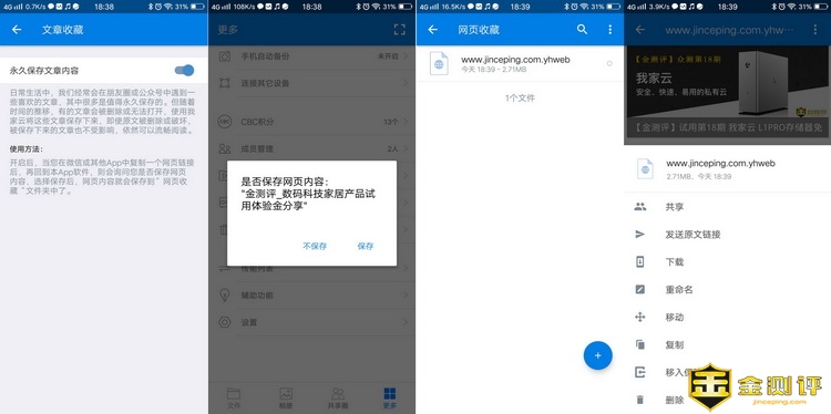 另一个文章收藏功能也是相当有意思,笔者以前看到实用文章都会另存为MHT网页文件,这个操作在手机就很不方便。而文章收藏功能只需要复制该网页的网址,回到我家云APP里,APP就会自动提示是否保存网页内存,然后在“文件”的网页收藏里就可以看到这个网址,进而打开 ,整个页面的内容都被保存下来了。