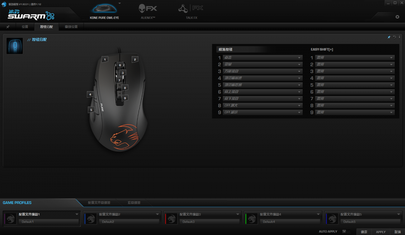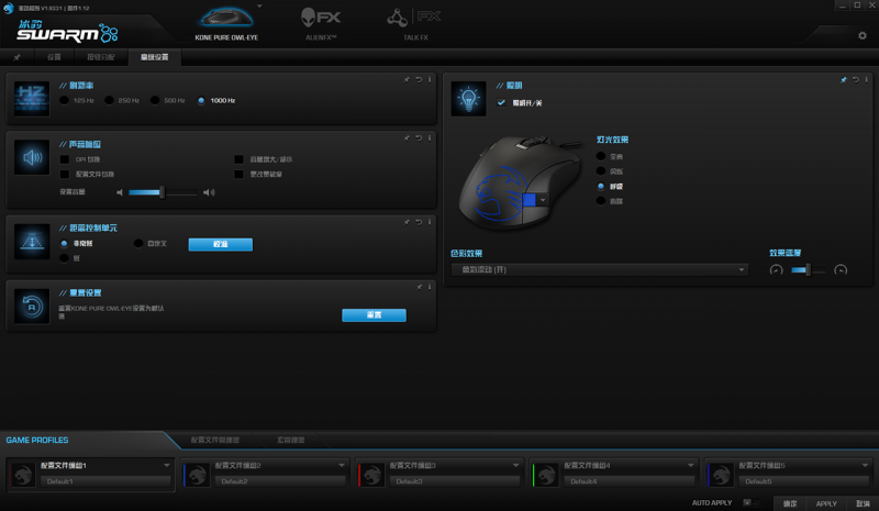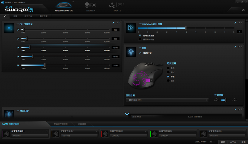 冰豹Kone Pure游戏鼠标是支持官方的ROCCAT Swarm软件的,可以通过官网下载,安装后插上鼠标会提示更新,然后就可以正常设置了。软件上可以对DPI的切换区间进行设置,还可以对指针速度,RGB灯效进行设置操作,灯光有四种效果,包含:全亮,闪烁,呼吸,心跳。