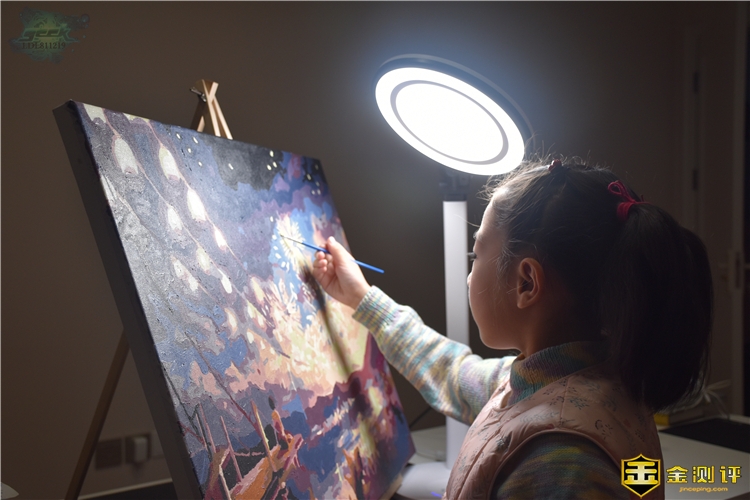 其实这次孩视宝最大的亮点在于面光源和环光源的结合,中间的面光源导光板,很好的完善中心照度,它是由670000个0.1毫米椭圆导光点漫射出来,而外圈灯则由25000个0.8毫米六边形蜂巢把光源方向彻底打散,环形扩散板提高边缘照度。融合两种光源的优点,孩视宝光线柔和舒适均匀,更接近于自然光,有效的让眼睛延缓疲劳孩视宝的自然高显指让色彩的还原度还是挺高的,使颜色在晚上也能看起来最接近自然光线下的色彩(上图:未开孩视宝;下图:开了孩视宝)圆形灯面的上面是亚光面蚀纹外观,具有良好的防反射、防滑、防刮损效果