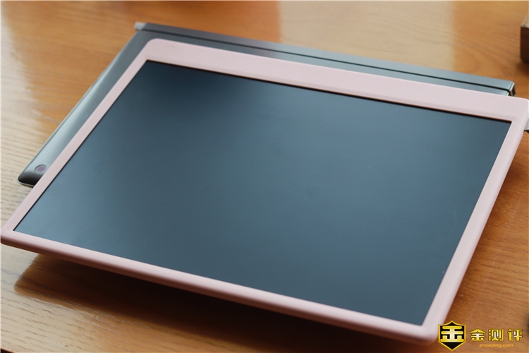 机器岛智能电子小黑板的框架采用ABS工程塑料,书写区域则是13.5英寸聚合物固态液晶显示软膜。小黑板尺寸与13英寸笔记本相当。厚度约8mm左右,三面边框较窄,约1cm。