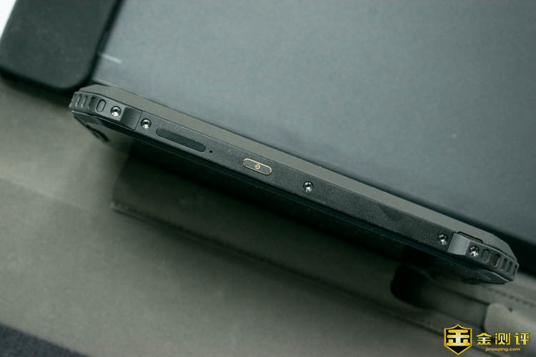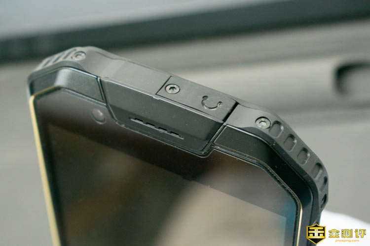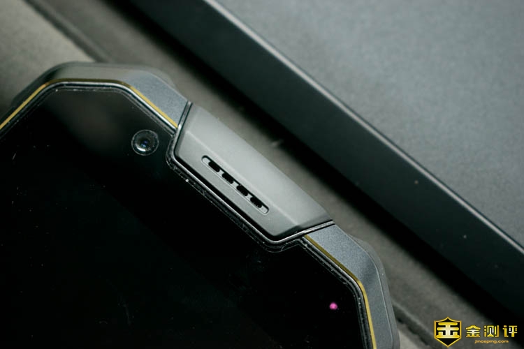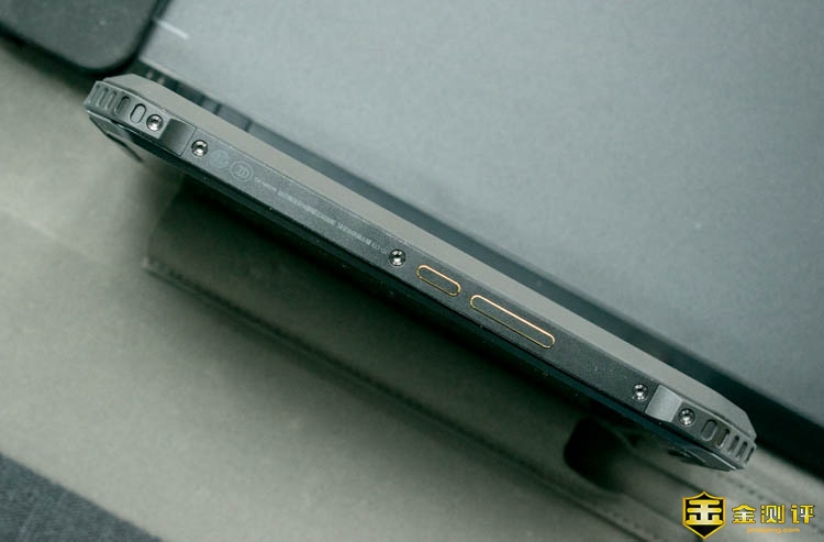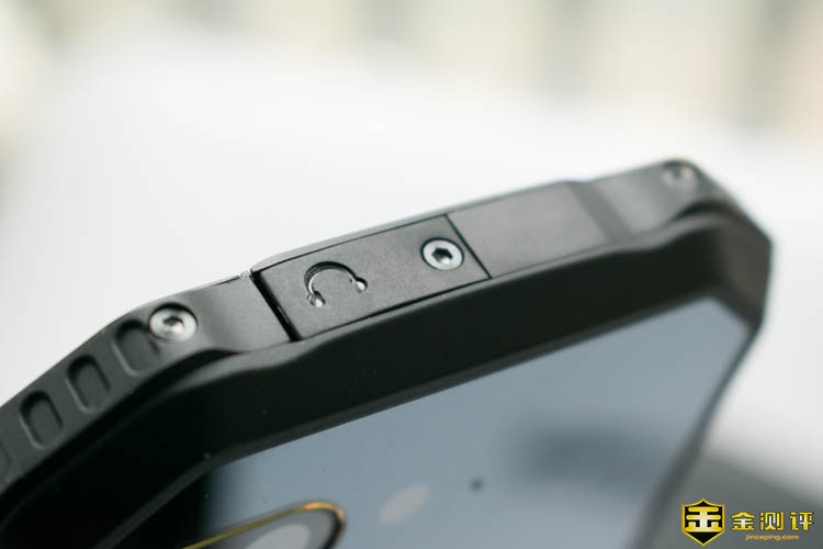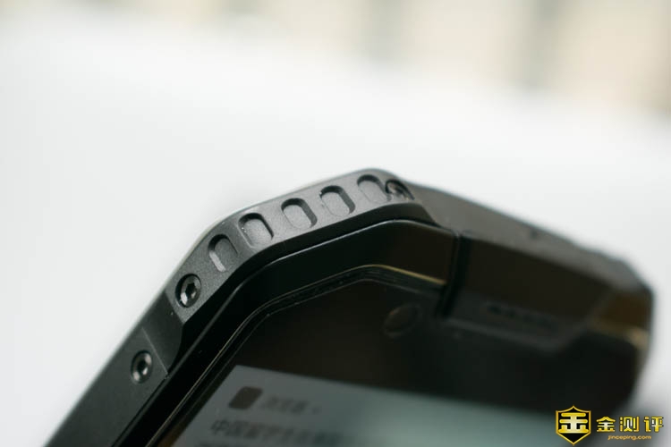 顶部以及侧面全部是橡胶侧面,还有可见的紧固螺钉。斜角还有椭圆形的凹洞防滑设计。根据介绍,这些是软硬胶 一体成型技术,为了对手机有很好的防护作用。