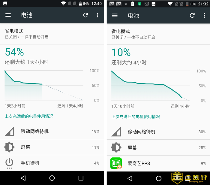 晚上就是熄屏待机状态,在这个状态下一直是14个小时,电量从60%降到了54%。然后再开着WiFi观看网络视频,将近9个小时后。那么结果电量降低到了10%。换句话说,在高负荷的情况下,近9个小时消耗的电量是44%。同前面第一次时的测试结果相近。