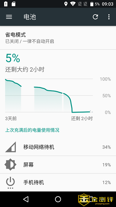 然后停止播放网络视频,切换为轻度普通工作状态,(熄屏,正常节奏用手机,几分钟拿起来一次,看看新闻、消息等月1-5分钟然后再放下熄屏),这用过了5个小时,显示用了3%的电量,预计还剩18个小时。(上图右侧)