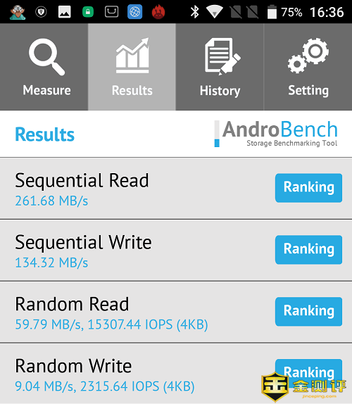 用AndroBench测下存储数据,顺序读写分别是261MB/s和134MB/s,还算可以。