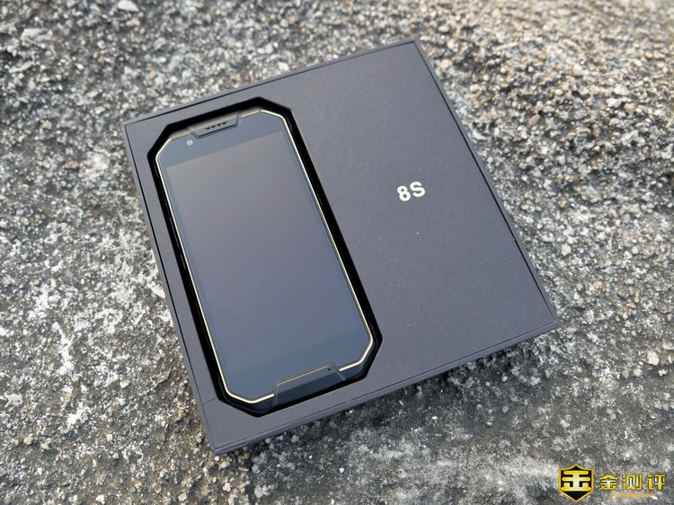 MANN 8S 三防智能手机安静的摆放在了内盒中,内盒的右侧还有8S的型号,由于笔者体验的是冷酷金的颜色,所以可以看到手机的外圈是金色的。