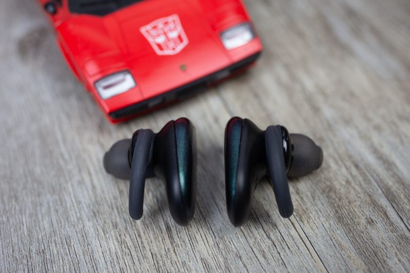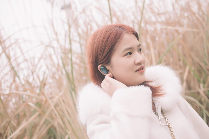 真无线耳机是十分强调佩戴这个关键点的,毕竟它们之间没有线缆,耳机单元又比较小,如果脱落遗失的话对于用户来说是个很大的损失!经过我和妹纸的试戴,我们终于可以放心了,这耳机由于内置了耳挂(FitFin固定鱼鳍耳胶),它能牢牢抓住内耳廓部位,在辅助稳定性方面提供了较大帮助,我试过在操场上百米冲刺和立定跳远,甚至狂甩头也没有掉落迹象,戴久了会产生“无感佩戴”的错觉,整体的佩戴舒适度表现出色。