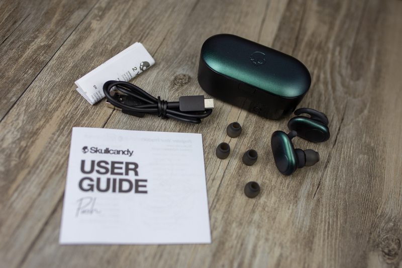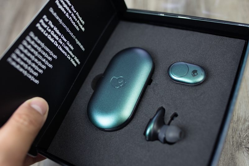 盒子里的物品有:Skullcandy Push耳机、充电盒、Type-C线缆、耳套、说明书。