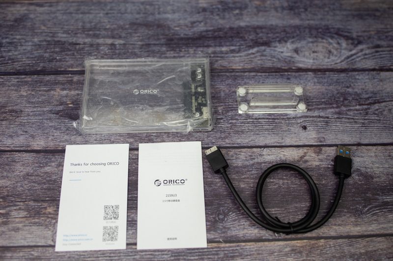 盒子里的物件:ORICO透明硬盘盒、底座、数据线、说明书保修卡和宣传小卡片。