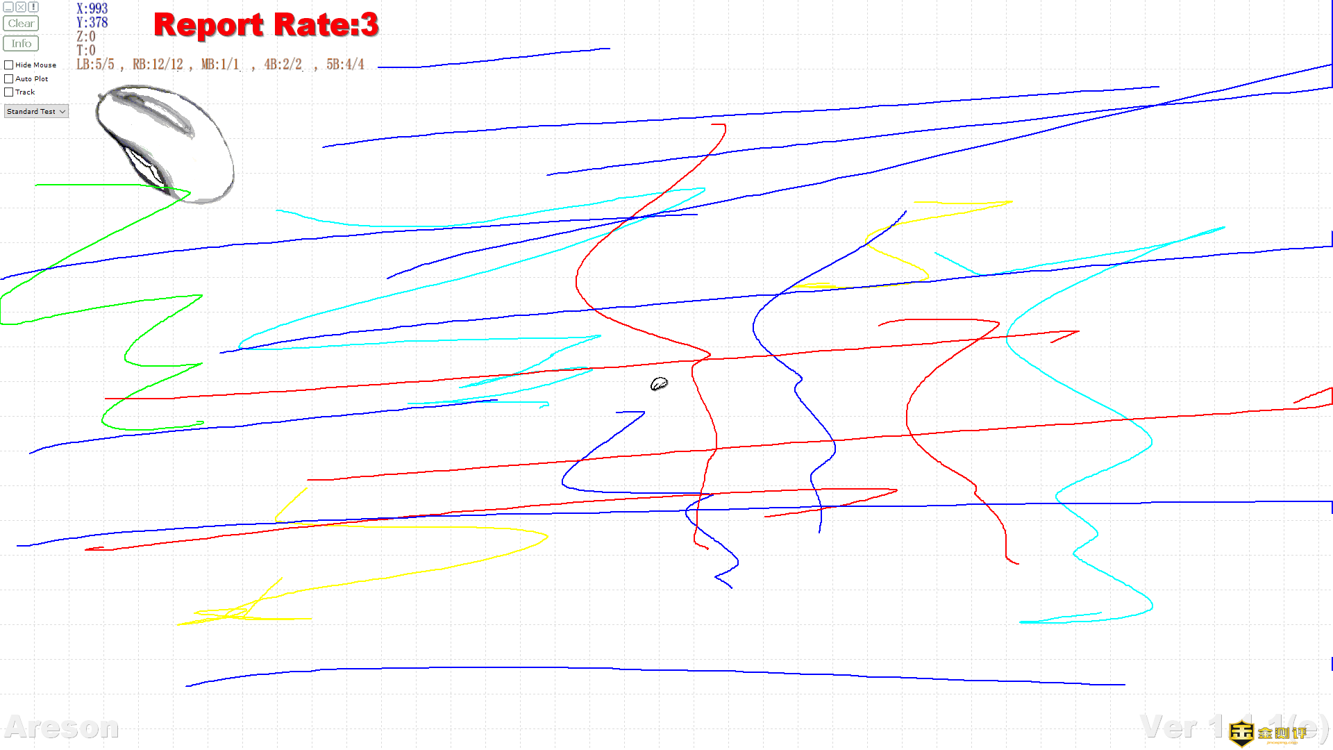 ▲使用 Mouse Test 软件进行测试,上图为有线模式的测试,回报率分别设置为250、500以及1000都测试一遍,然后DPI也搭配2000、3000和5000一起测试。