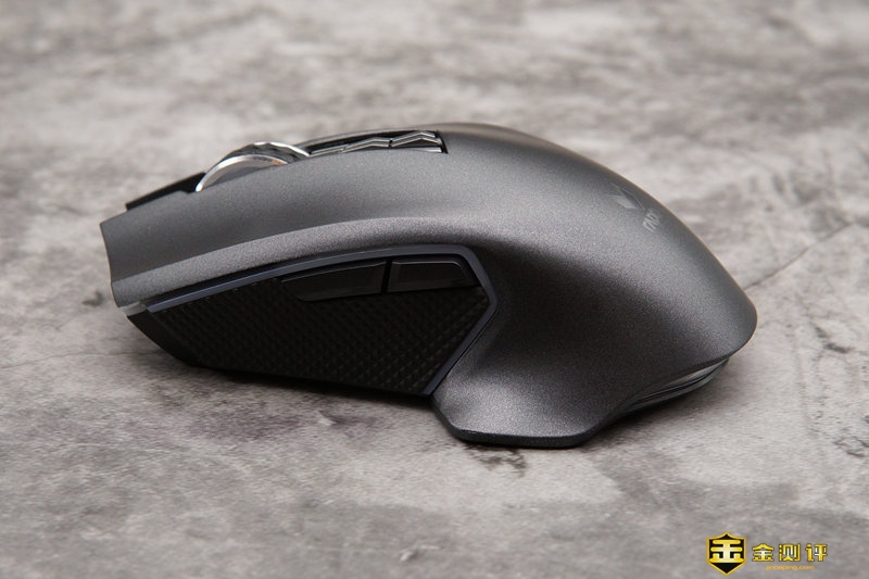 鼠标的形状是对称的,左侧拇指放置区域覆盖了防滑纹路,设计有2枚可编程按键,从侧面也可以看到这款鼠标的曲线设计,有一定厚度,食指和中指按钮部分是微微下凹的。