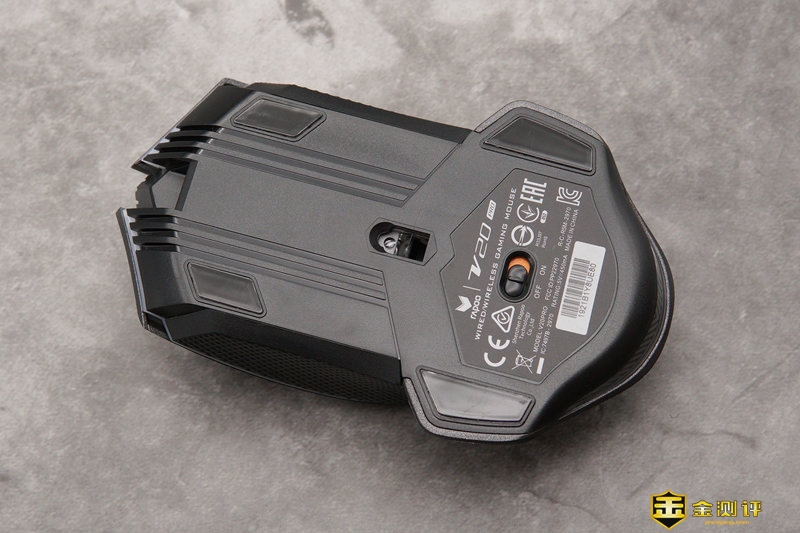 鼠标主体,外观一看就是典型的游戏鼠标风格,比较有进攻性,塑料材质,颜色为金属质感的深灰色,滚轮两侧为金属环点缀,宽度约9mm,滚轮的阻尼感相对我之前用的办公鼠标来说稍强,段落感明显,滚轮橡胶的纹路做的比较大,下方有两枚银色的DPI按键,一个是加,一个是减,这方面设计还不错,因为很多鼠标都只给一个DPI按键,切换的时候是循环的,那么V20 PRO双模版上的这个就可以根据需求来增减了,更方便一些。