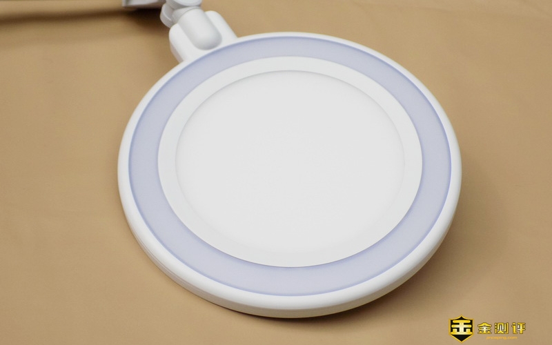 台灯的底座采用了一体式触摸控制面板设计,没有突起的物理按键,表面磨砂处理,手感温润细腻,容易清洁。底座面板印着清晰的触摸键,“笑脸曲线”是具有灯效的调光滑动带,“笑脸曲线”的左端是电源开/关键,右端图形只是亮度标识,没有控制功能。按钮上方为感光芯片,配合感光按钮自动调节亮度。▼
