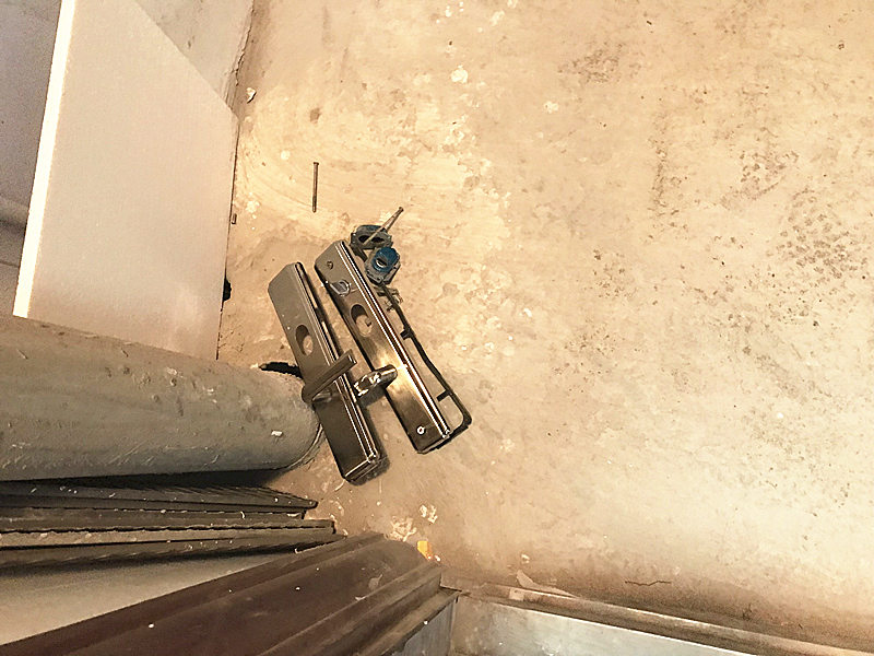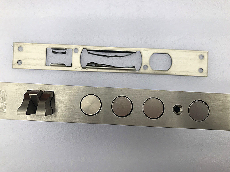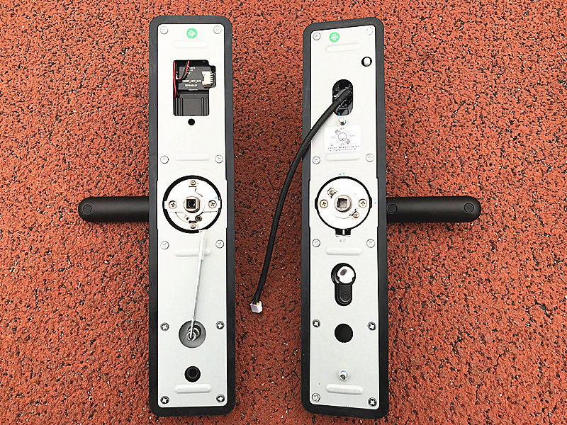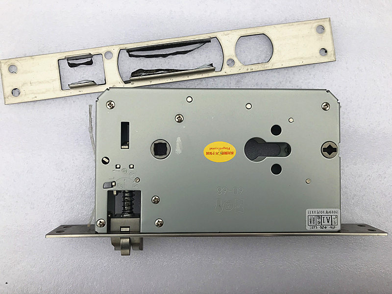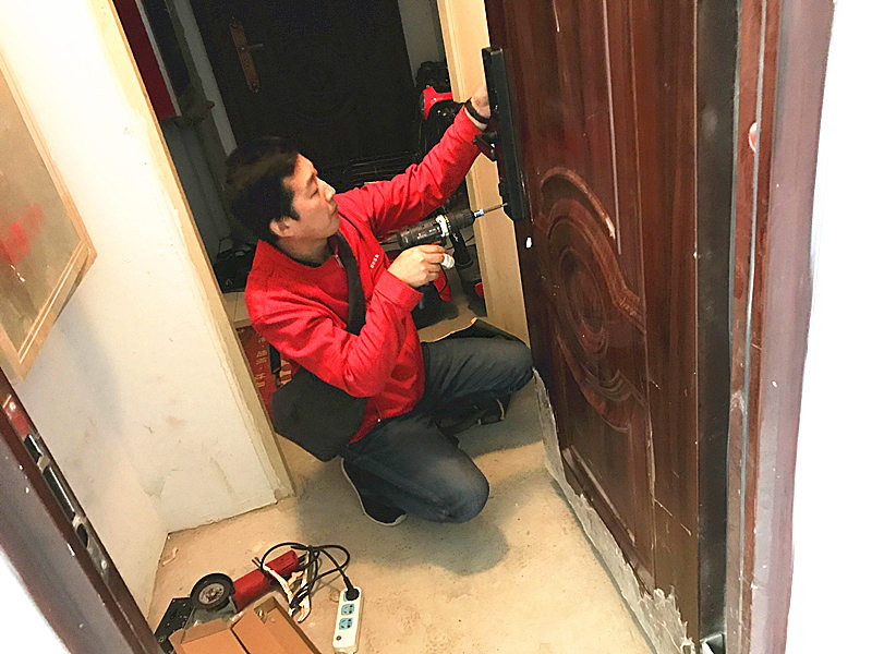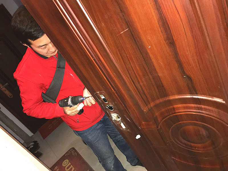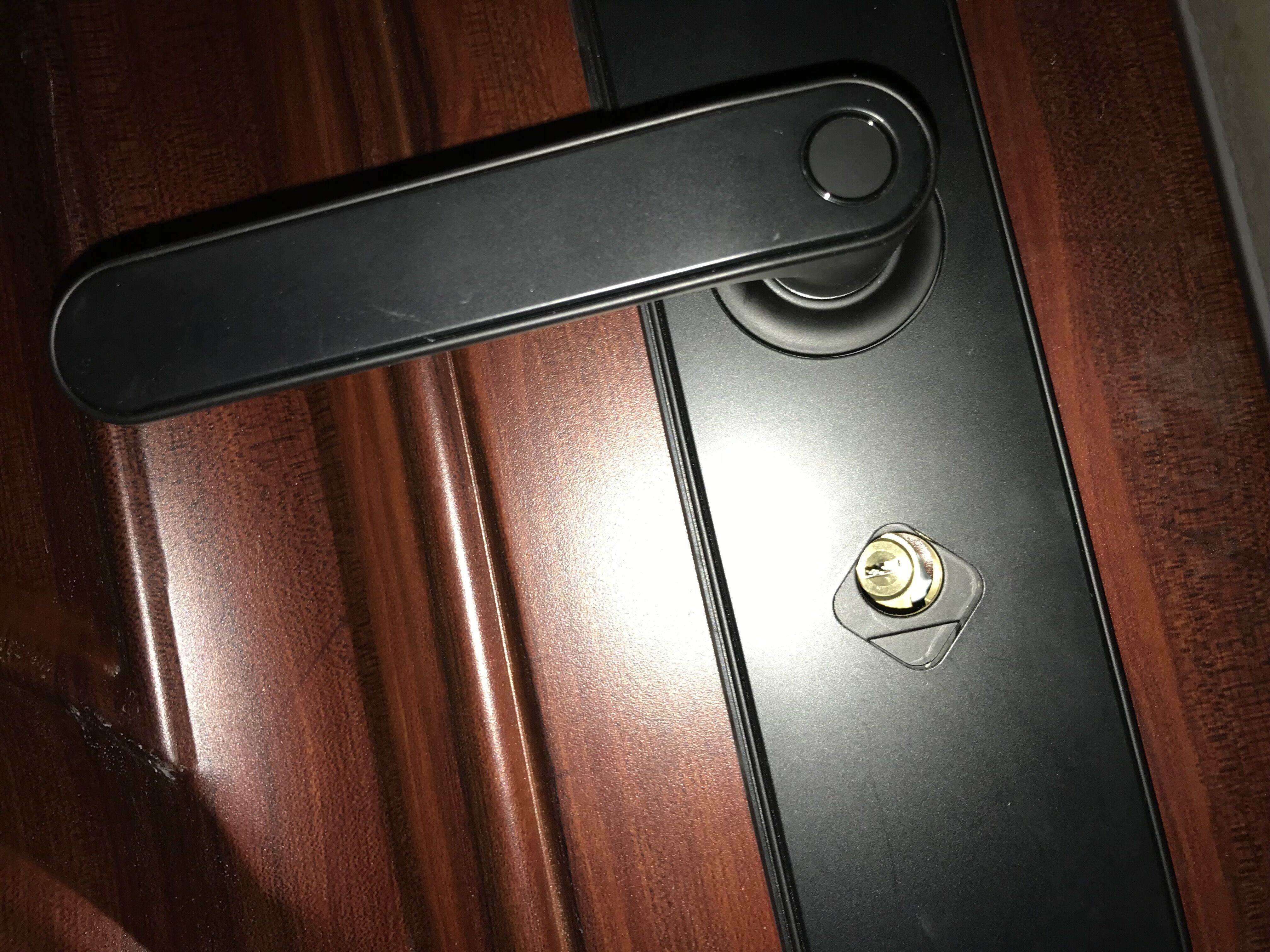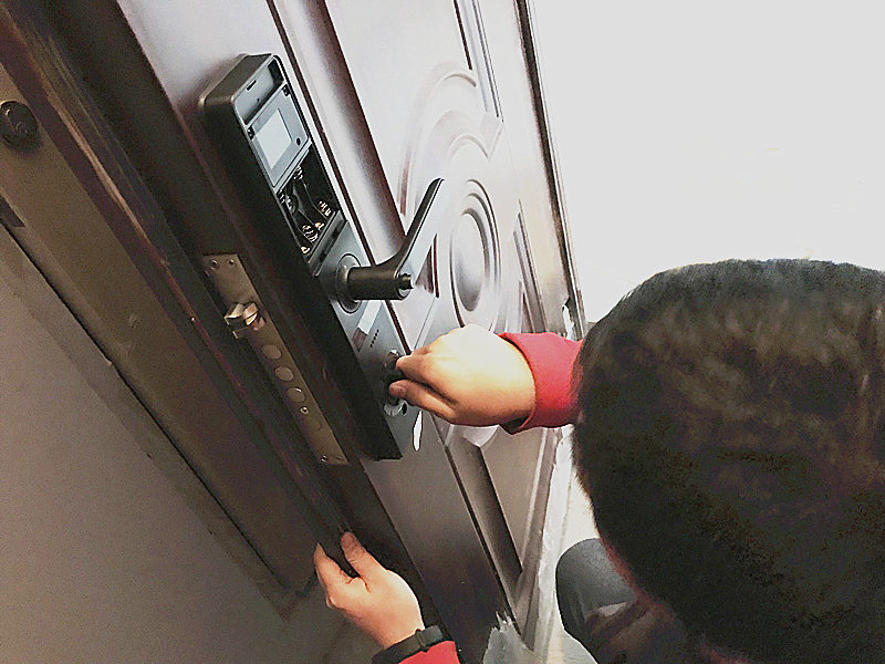 第一次安装之后,小哥跟我特别在门外试验了一下,估计是有上的锁芯有不合适的地方,指纹识别和开锁卡识别没问题,自动识别,但是识别后门不能自己关好,而且反锁的功能也存在缺陷,安装师傅说是锁芯里面的连接柱过长造成的,所有又拆下来重新截取了一段后再次安装。