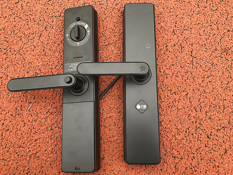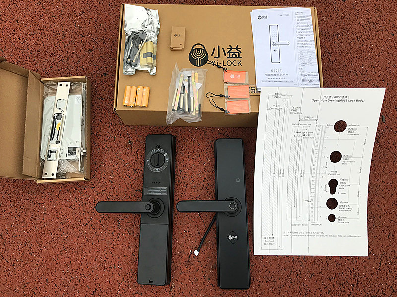 小益智能指纹锁的门把手分为内外两个,产品的说明书、门锁的开孔图、小益门禁卡、小益智能锁的应急钥匙、小益智能锁天猫精灵的模块、4节5号电池、各种螺丝、方棒等构成了智能锁的全家福。