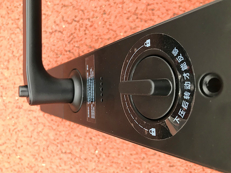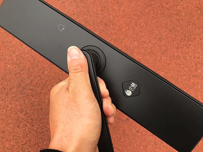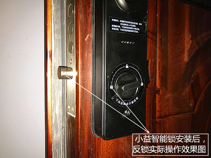 关于反锁按钮,跟咱们家庭普通的不太一样,普通家庭的一般反锁钮比较小,不会这么大,更重要的是直接旋转就可以反锁了,小益指纹智能锁反锁的时候需要下压后转动才行。