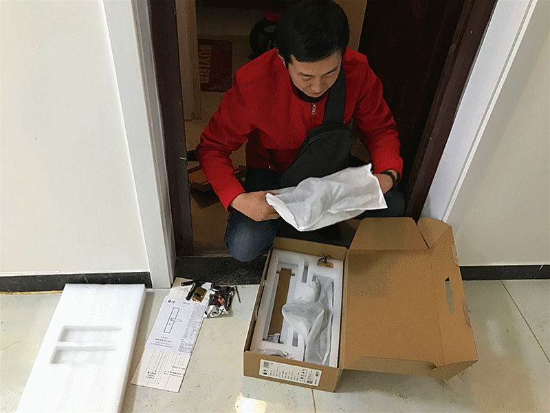 小益智能指纹锁的安装,奶爸没有亲自动手的勇气,约来了咱们的售后安装师傅。安装师傅是一个小帅哥,上门时间非常准时,到了后就开始检查小益智能指纹锁的主配件,在确定主配件齐全和看完门锁后就立马开工啦!受双十一天猫购物狂节的影响,咱们的售后安装虽有一点延迟,但是还是在规定时限内安装啦!