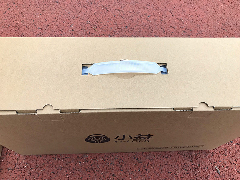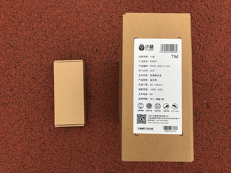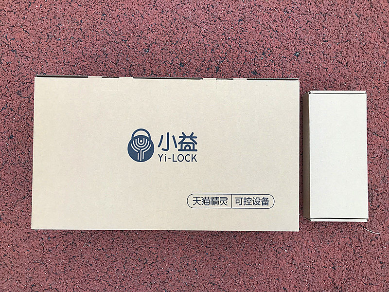 小益智能指纹锁的包装外包装采用不多见的礼盒式外包装,除去外包装箱后,内部分为两个盒子,大盒子采用手拎提手加通体铜版纸色设计,整体包装的档次感比较出众。大盒子里放的是指纹锁主体,小盒子里放的是锁具。