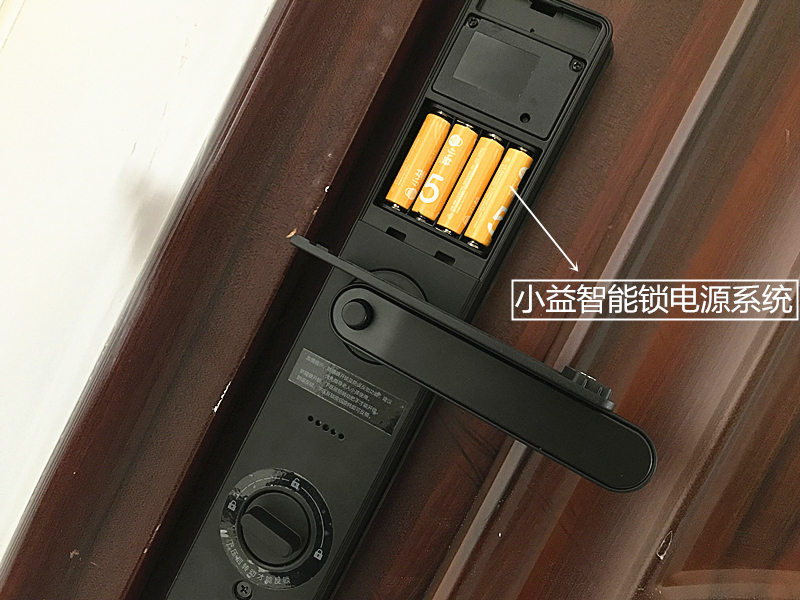 如上图所示,小益智能指纹锁使用的是4颗5号电池进行供电,但其功耗极低,质量好的南孚聚能环电池待机使用一年应该不是问题,电池电量较低的时,智能锁会提醒用户更换电池;如果电量耗尽了,我们也能通过钥匙开锁,通过面板底面的Micro USB应急电源接口,用充电宝临时供电。