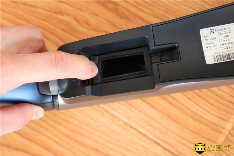 ▲从产品标识上可以看到,产地为匈牙利,机身与集尘桶连接的部分,也做了比较好的尘土防护,从我手指部位可以清晰的看到橡胶防护垫。
