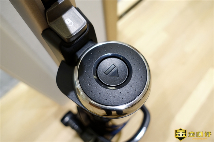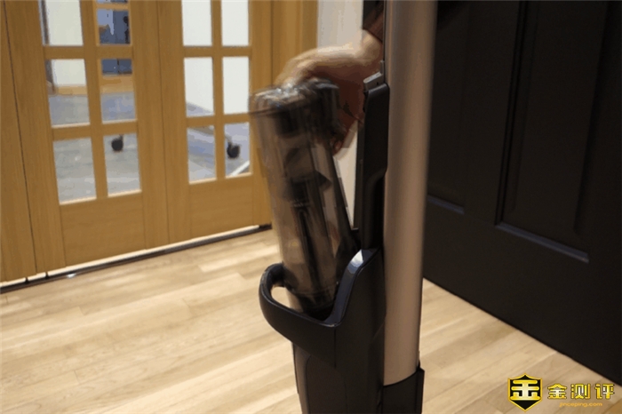 在吸尘器的主机上有一个尘桶,这个尘桶的拆卸采用的是一键式的操作,可以看到,顶部有一个按钮,当需要使用的时候,只需要按一下即可轻松的拆卸。