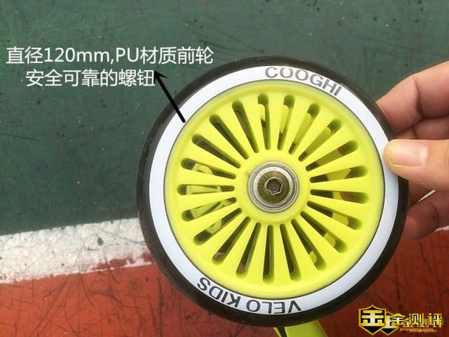 酷骑滑板车采用的是直径120mm的PU材质耐磨前轮,结实稳固的同时样式还非常新颖,车轮上还采用浮雕技术在轮子的侧面印上了酷骑的LOGO ,看上去非常的时尚潮流……酷骑滑板车采用实心轮胎,无需充气,通过性强,各种路面的防震性相当好。