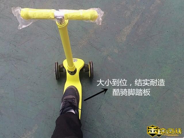 再看酷骑滑板车的脚踏板,大小到位、结实耐造和承重力较强,上面的就是招财猫的大脚,小宝桃桃的脚放4只没有任何问题哦。脚踏板的厚底也很到位,50kg的承重力,招财猫特地踩了踩滑板车,家里的小宝玩绝对没有问题……