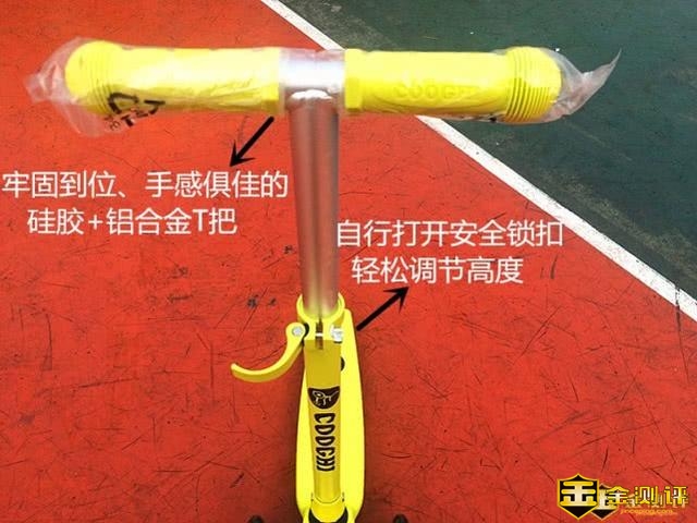 酷骑滑板车的T把采用铝合金材质制作,T把把手上用结实耐用、不易脱落和颇具摩擦力的环保软胶,可以放心的给孩子使用玩耍。为了方便调整车身高度,孩子可以自行打开安全锁扣轻松的进行62-82cm范围内的调整。T把杆前部和脚踏板上部都采用浮雕技术印制了酷骑品牌的LOGO,让孩子和滑板车拥有绝对高的回头率。