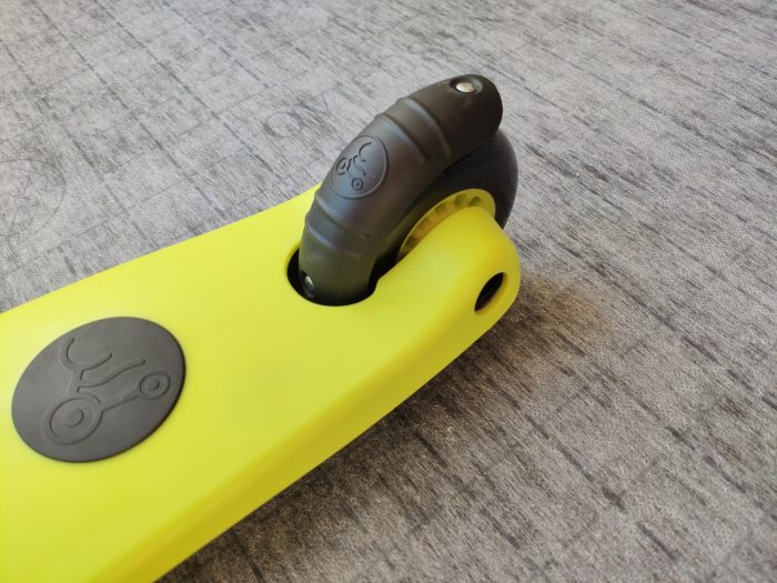 因为后轮是刹车轮,所以后轮设计的较小,这样可以方便踩踏刹车板。塑料的刹车踏板内部固定有金属刹车片,从而保证长期有效使用。