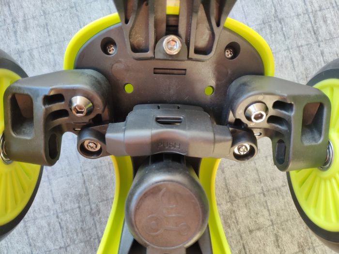 酷骑V1是通过重力控制方向,轻微倾斜身体,依靠重力完成转向。这种方式不仅能防止滑行侧翻,还能锻炼儿童的平衡能力。在重力转向组件中,还有转向开关,翻转车身可以看到PUSH键即是,通过PUSH可以控制是否支持重力转向。