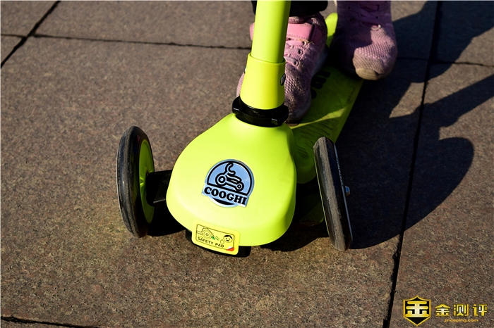 滑板车的后轮尺寸为80mm,同样也采用了PU材质,再搭配专业刹车片,能够带来更好的制动性,滑动过程中踩踏后轮顶部的刹车片,即可让滑板车停止。