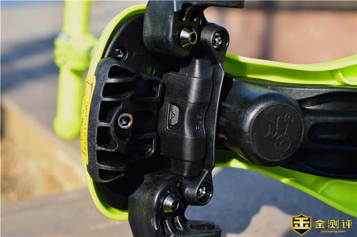 酷骑V1多功能滑板车的底部采用了黑色ABS材质,其中靠近前方车头的位置有个“PUSH”键,当按压后上面露出三角形按钮,表示滑板车处于锁定状态,无法进行重量转向,再次按压三角形按钮,即可恢复重力转向。