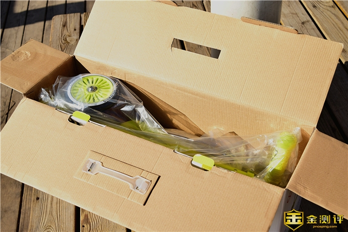 酷骑V1多功能滑板车采用了白色的纸质包装盒,正面印有产品的实物宣传图和品牌标识,全部采用了英文,看上去很有国际范,不过既然是在国内销售,个人感觉还是采用中文注释更好;顶部还有个塑料提手,可以便于用户移动。