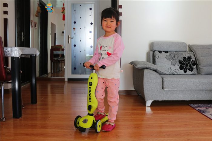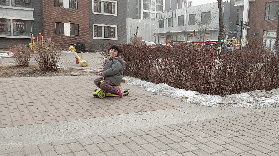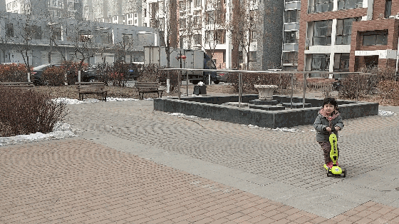 我家这位爱玩滑板车,而且非常熟练,刚拿到楼下,便开始飞奔起来。