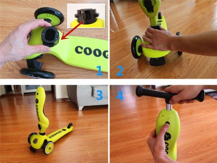 这款酷骑滑板车的设计巧妙之处就在于不用很麻烦就可以转换形态,从滑行模式到骑行模式,按照图示将卡钳打开,然后将立把旋转至图三状态,锁住卡钳,最后将T把更换位置,转换完成。