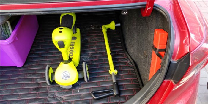 这款酷骑Velo Kids3可以轻松的放置在后备箱中收纳,我家车后备箱属于比较小了,但是可以看到轻松放置滑板车以后,还有很大的空间放其他东西,出门携带一点问题都没有。