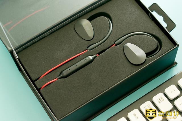 打开盖子,终于看见有点个性的造型了。黑色的耳机、红色的耳机线、黑色的线控,有些精致的感觉。特别是耳机的设计,三角形、椭圆的结合,颇有几分科技感。