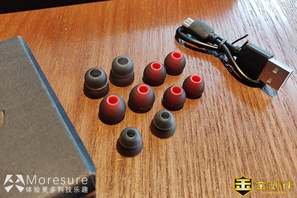配件有5套备用耳塞套,默认耳塞套是双层结构,相对隔音效果好一些,单层结构的耳塞套才用外黑内红的配色,沉稳闷骚,不同喜好和耳洞大小的朋友使用都可以满足。