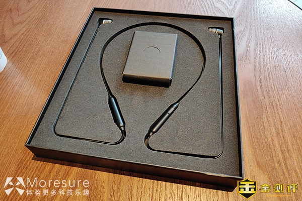 打开包装,耳机嵌入在硬泡沫当中,初看耳机比市面上其他的耳机相对长一些,整体黑色,虽然盒子比较大,但是包装内比较简单,中间小盒子是相应配件。